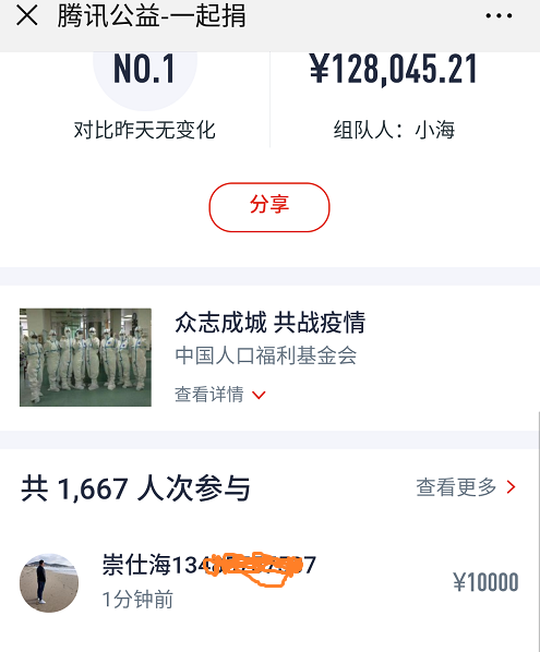 近日為抗擊新型冠狀病毒感染肺炎,多方捐款, 向陽社區居民崇仕海一次性在安徽計生協公益平臺捐款10000元,為抗疫貢獻力量。廣大居民進行了金額不等的捐助。