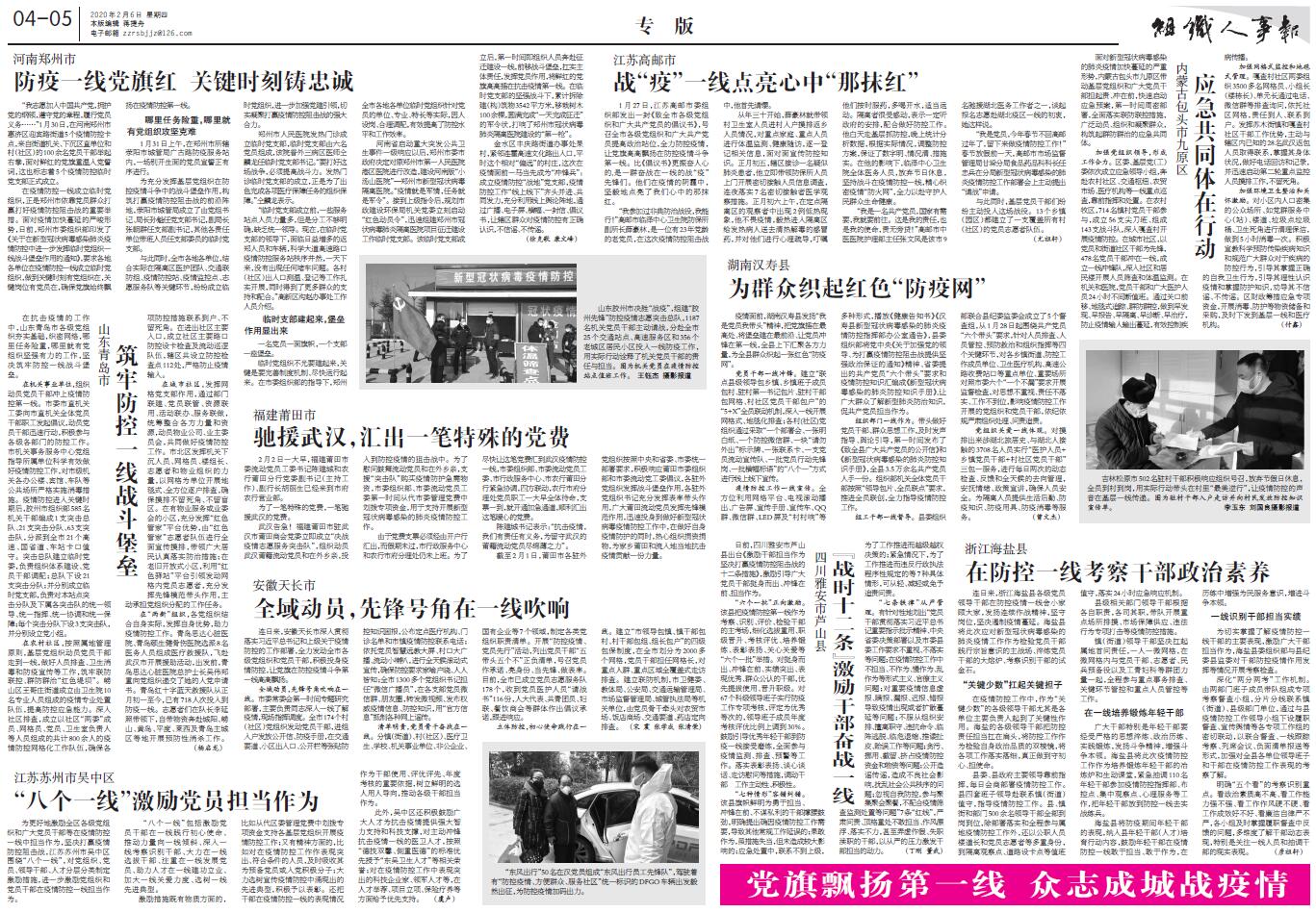 連日來,安徽天長市深入貫徹落實(shí)習(xí)近平總書記和上級關(guān)于疫情防控的工作部署,全力發(fā)動(dòng)全市各級黨組織和黨員干部,積極投身疫情防控,讓黨旗在防控疫情斗爭第一線高高飄揚(yáng)。全域動(dòng)員,先鋒號角吹響在一線。市委常委會第一時(shí)間專題研究部署,主要負(fù)責(zé)同志深入一線了解疫情,現(xiàn)場指揮調(diào)度。全市174個(gè)村(社區(qū))黨組織發(fā)動(dòng)黨員干部,進(jìn)組入戶發(fā)放公開信、防疫手冊,在交通要道、小區(qū)出入口、公開欄等張貼防控知識畫報(bào),公布定點(diǎn)醫(yī)療機(jī)構(gòu)、門診名單和市鎮(zhèn)疫情防控聯(lián)系電話;依托黨員智慧遠(yuǎn)教大屏、村口大廣播、流動(dòng)小喇叭,進(jìn)行全天候滾動(dòng)式宣傳,確保防控要求家喻戶曉、人人皆知;全市1300多個(gè)黨組織書記擔(dān)任“微信廣播員”,在各支部黨員微信群、朋友圈,轉(zhuǎn)發(fā)微視頻、發(fā)布權(quán)威疫情信息、防控知識,用“官方信息”抵制各種網(wǎng)上謠傳。清單明責(zé),黨員骨干奮戰(zhàn)在一線。分鎮(zhèn)(街道)、村(社區(qū))、醫(yī)療衛(wèi)生、學(xué)校、機(jī)關(guān)事業(yè)單位、非公企業(yè)、國有企業(yè)等7 個(gè)領(lǐng)域,制定各類黨組織職責(zé)清單。開展“防控疫情、黨員先行”活動(dòng),列出黨員干部“五帶頭五個(gè)不”正負(fù)清單,號召黨員作承諾、亮身份、當(dāng)先鋒、做表率。目前,全市已成立黨員志愿服務(wù)隊(duì)178 個(gè),收到黨員醫(yī)護(hù)人員“請戰(zhàn)書”116份,人大代表、共青團(tuán)員、婦聯(lián)、餐飲商會等群體作出倡議承諾,跟進(jìn)響應(yīng)。立體防控,初心使命踐行在一線。建立“市領(lǐng)導(dǎo)包鎮(zhèn)、鎮(zhèn)干部包村、村干部包組、組長包戶”的四級包保制度,在全市劃分為2000 多個(gè)網(wǎng)格,黨員干部擔(dān)任網(wǎng)格長,對重點(diǎn)人群、重點(diǎn)區(qū)域全覆蓋式走訪排查。建立聯(lián)防機(jī)制,市衛(wèi)健委、教體局、公安局、交通運(yùn)輸管理局、市場監(jiān)督管理局、城管執(zhí)法局等機(jī)關(guān)單位,由黨員骨干牽頭對農(nóng)貿(mào)市場、飯店商場、交通要道、藥店定向排查。(宋震 張學(xué)成 張清榮)