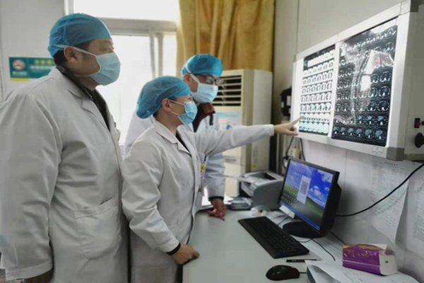 圖為劉菊(中)和專家組組長李秋水、感染科主任李平正對發熱患者進行排查討論。