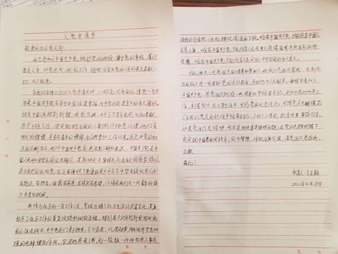 在這場沒有硝煙的防“疫”戰(zhàn)中,街道和社區(qū)黨組織動員廣大黨員沖鋒在前、挺身而出,影響和帶動了一批工作在疫情防控一線的年輕干部積極向黨組織靠攏,街道和社區(qū)黨組織先后收到多名年輕基層工作人員遞交的入黨申請書。一封封入黨申請書無聲的“請戰(zhàn)書”,見證街道全體黨員和工作人員的責(zé)任和擔(dān)當(dāng)。