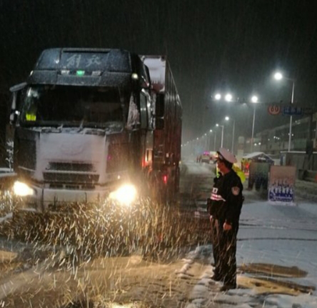 他們是公安藍。天長市公安局秦欄鎮派出所全體干警,風雪夜中仍然堅守崗位,宿揚高速秦欄收費站口、蘇皖交界的路口都有他們的身影。他們的主要任務是排查登記從外地進入秦欄的車輛和人員,是秦欄鎮 “外防輸入”的第一道防線。執勤中的他們不顧打在身上的雪花,變成了最美“雪人”。