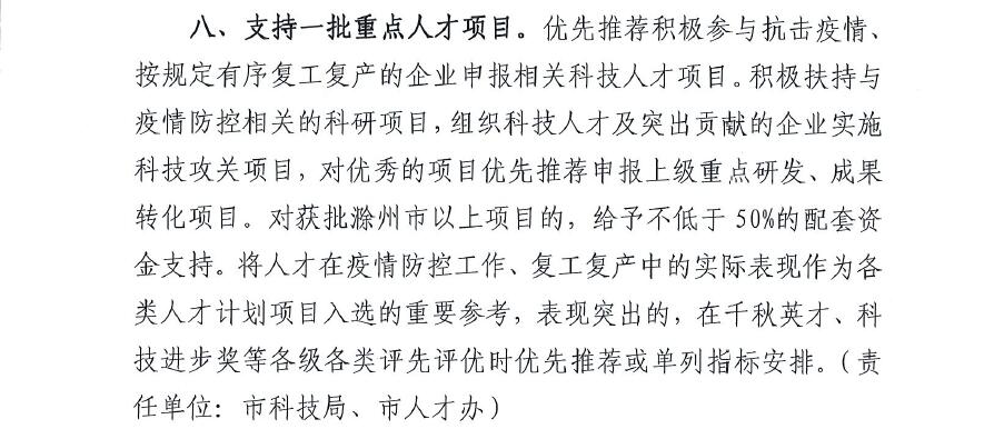 設立“激勵包”。優(yōu)先扶持與疫情防控相關的科研項目,優(yōu)秀項目優(yōu)先推薦申報研發(fā)和成果轉化,對獲批上級項目的,給予不低于50%的配套資金支持。同時,將人才在疫情防控工作、復工復產中的表現(xiàn),作為人才計劃項目入選的重要參考,表現(xiàn)突出的,在各級各類評先評優(yōu)中優(yōu)先推薦或單列指標安排。