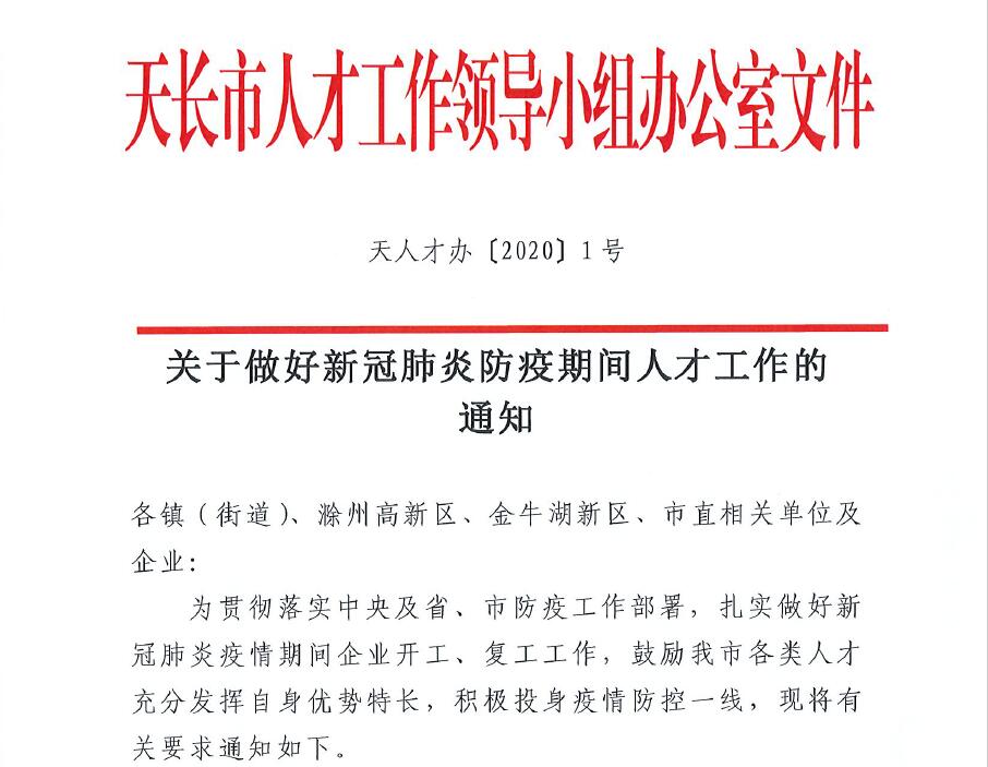 近日,天長市下發(fā)《關于做好新冠肺炎防疫期間人才工作的通知》,細化制定十條服務人才具體舉措,“包保”服務人才安全上崗,助力企業(yè)復工復產。