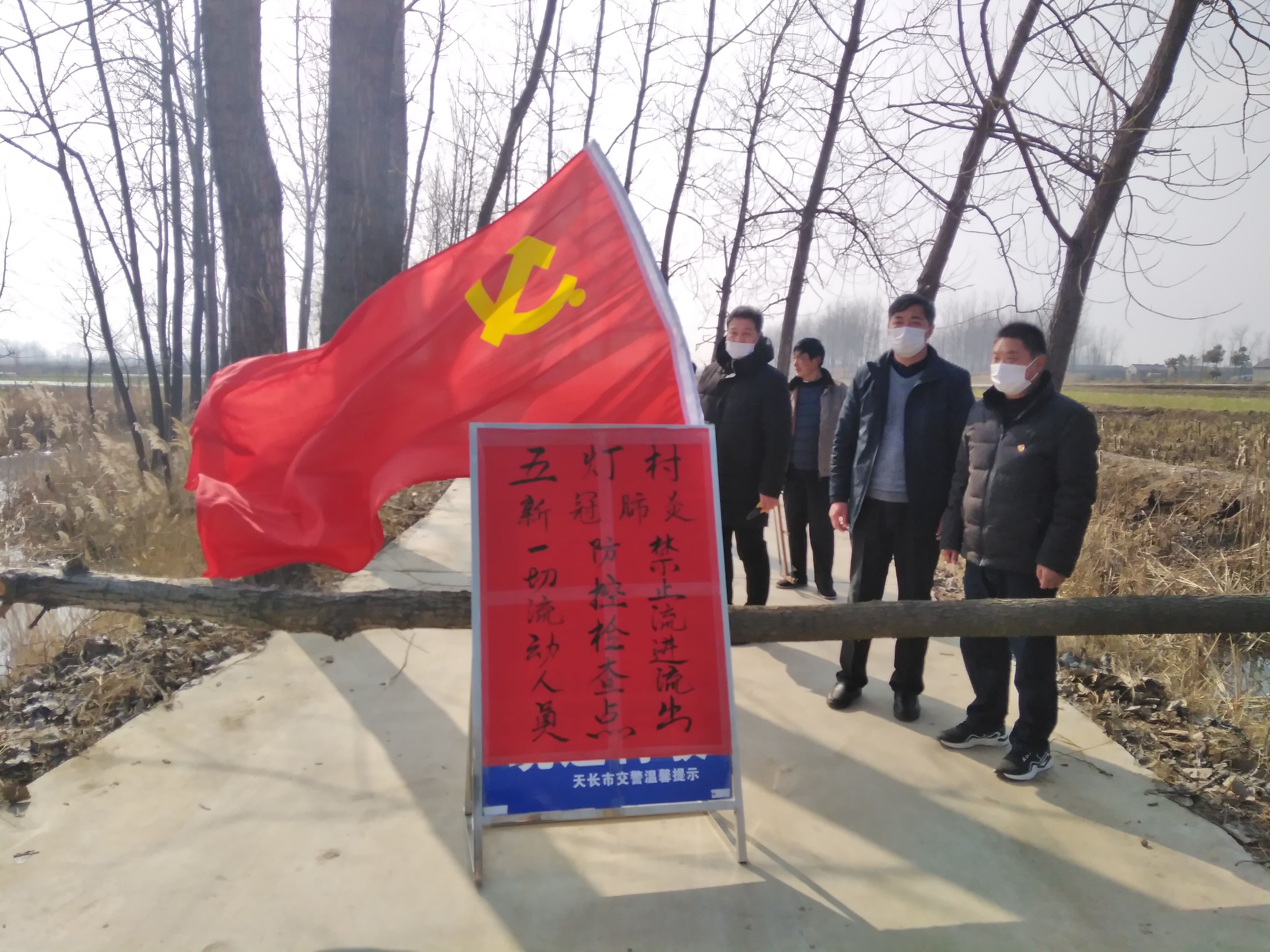 2020年2月11日,會后五燈村總支班子落實會議精神,及時在沿蘇線設立防疫卡點,禁止兩省之間人員流動,勸導流出和流入,全體黨員干部排班24小時堅守在卡口,杜絕疫情傳播。