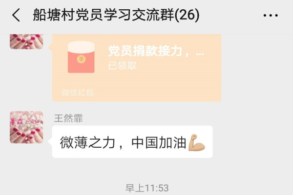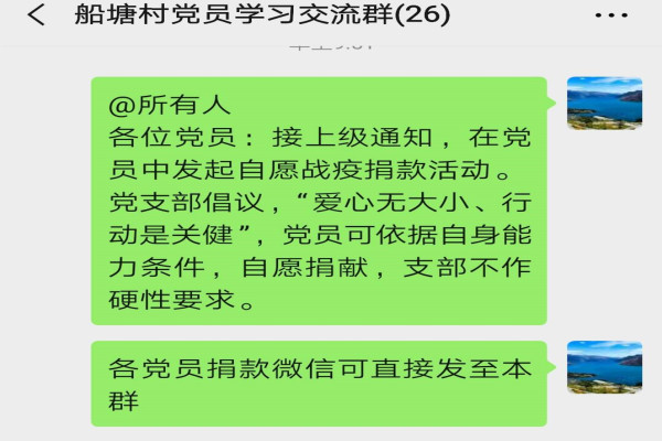船塘村30名黨員,除2名特殊困難黨員之外,此次參與捐款人數達到28人。“我們也沒有想到這次黨員這么積極,在黨建工作群中一號召,所有黨員立即通過微信、支付寶等方式轉賬,表達與祖國共抗“疫”的信念,祝福武漢加油、中國加油!”船塘村黨支部書記虞元彬說。其他不在黨建工作群中的黨員,則由村干分片上門動員,得知情況后,大家二話沒說,紛紛解囊,表示國家有難,作為黨員定當竭力支持。