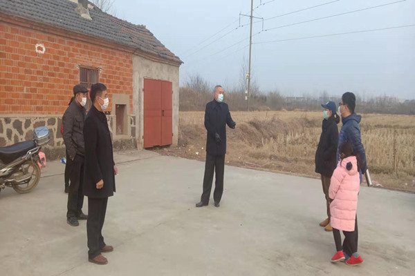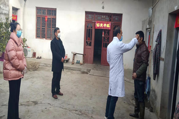 鎮村黨員干部及村醫走訪何莊村武漢返鄉人員及外返人員,村醫為其量體溫