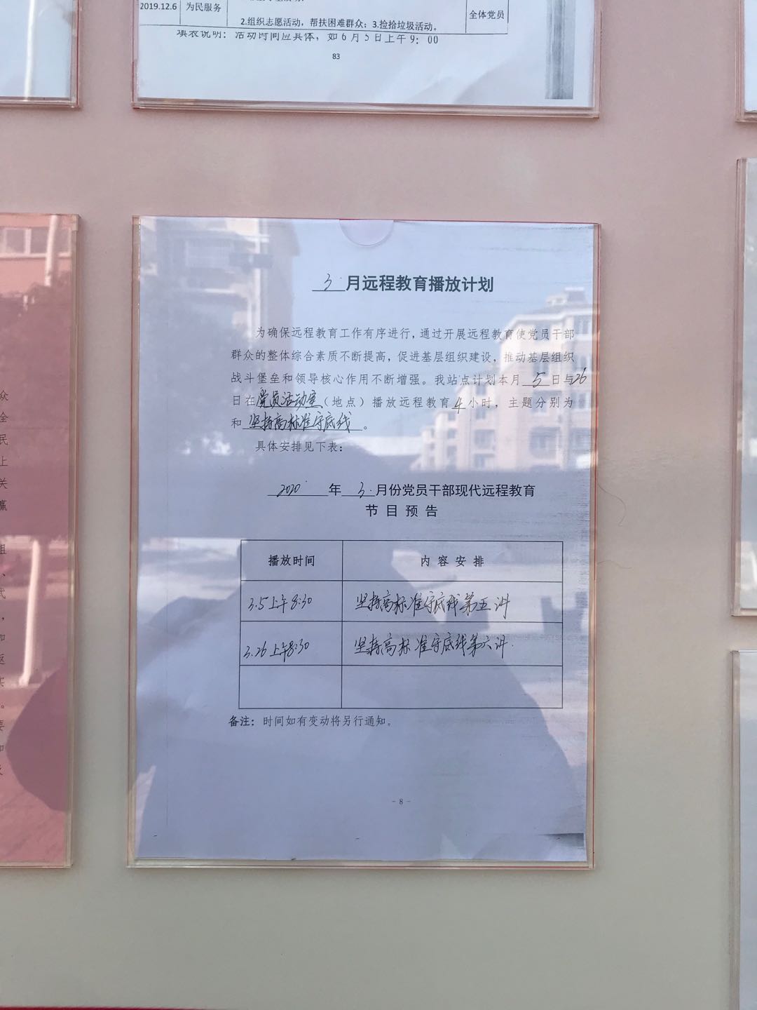 十八集社區3月份黨員遠程教育播放計劃于2020年3月5日上午八點半在黨員活動室播放《堅持高標準守住底線》第五講,2020年3月26日上午八點半在黨員活動室播放《堅持高標準守住底線》第六講。