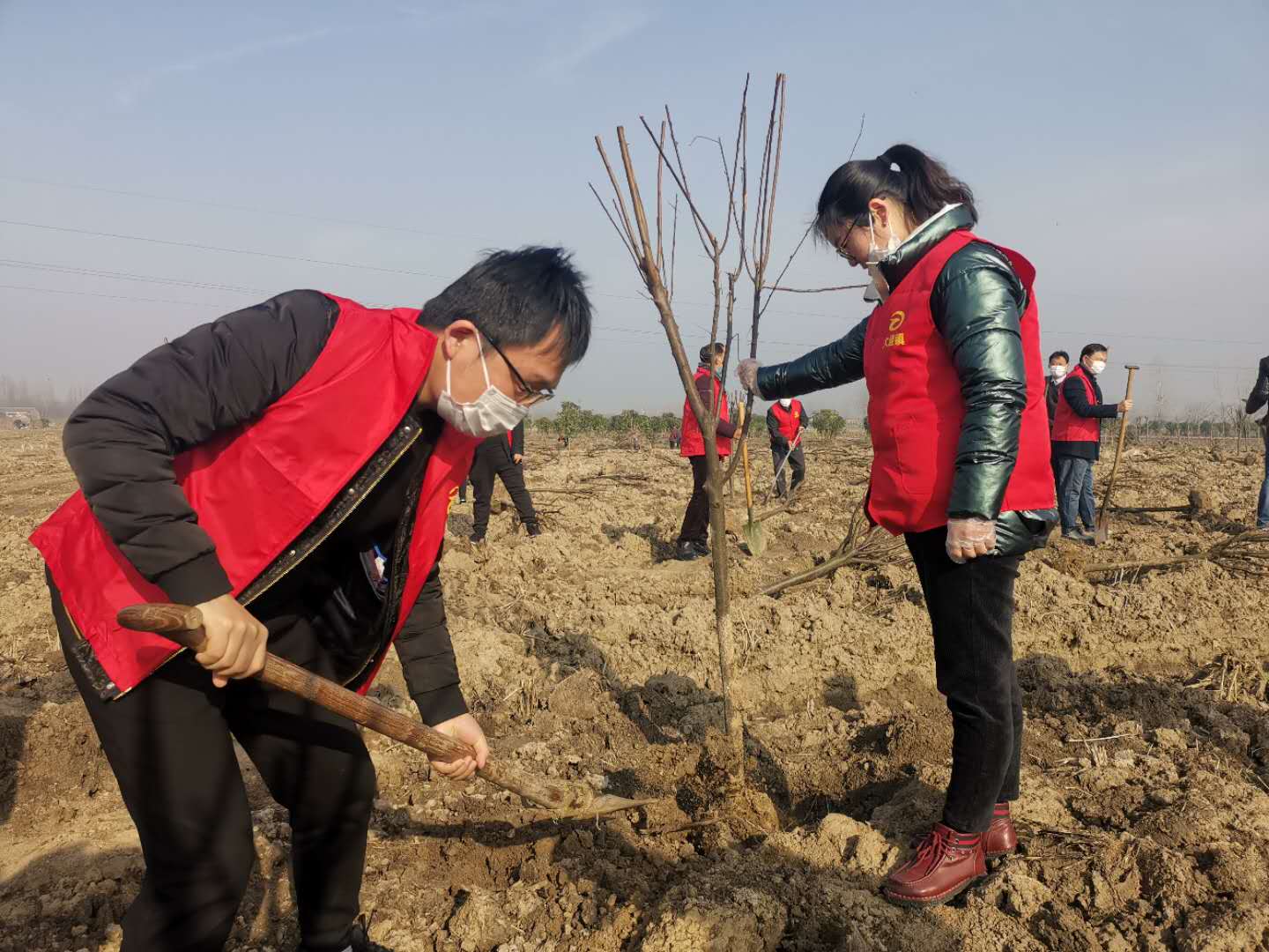 早上8點半,大家準時趕到便益社區鄭莊。隨后青年志愿者們態度積極,興致勃勃地投入到植樹活動中。活動現場,志愿者們挖坑種樹、鏟土培實、三人成組、五人組隊,每道工序都認真細致、一絲不茍,處處都是忙碌的身影。一番熱火朝天的勞動后,一棵棵新栽種的樹苗亭亭玉立,在明媚的春光中展現勃勃生機,為初春的大通平添絲絲活力。經過一個多小時的奮戰,幾十棵樹苗在此安家落戶。