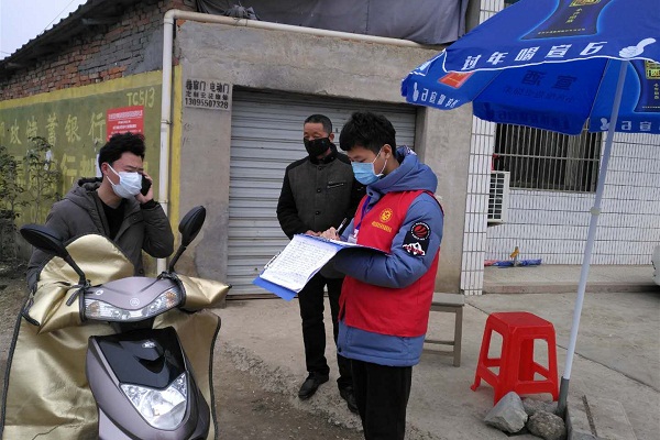志愿者在農(nóng)村卡點(diǎn)登記進(jìn)出居民