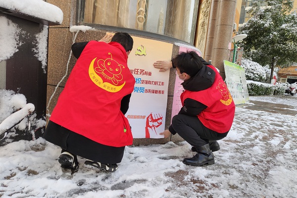 下雪天志愿者在轄區(qū)內(nèi)張貼疫情宣傳畫