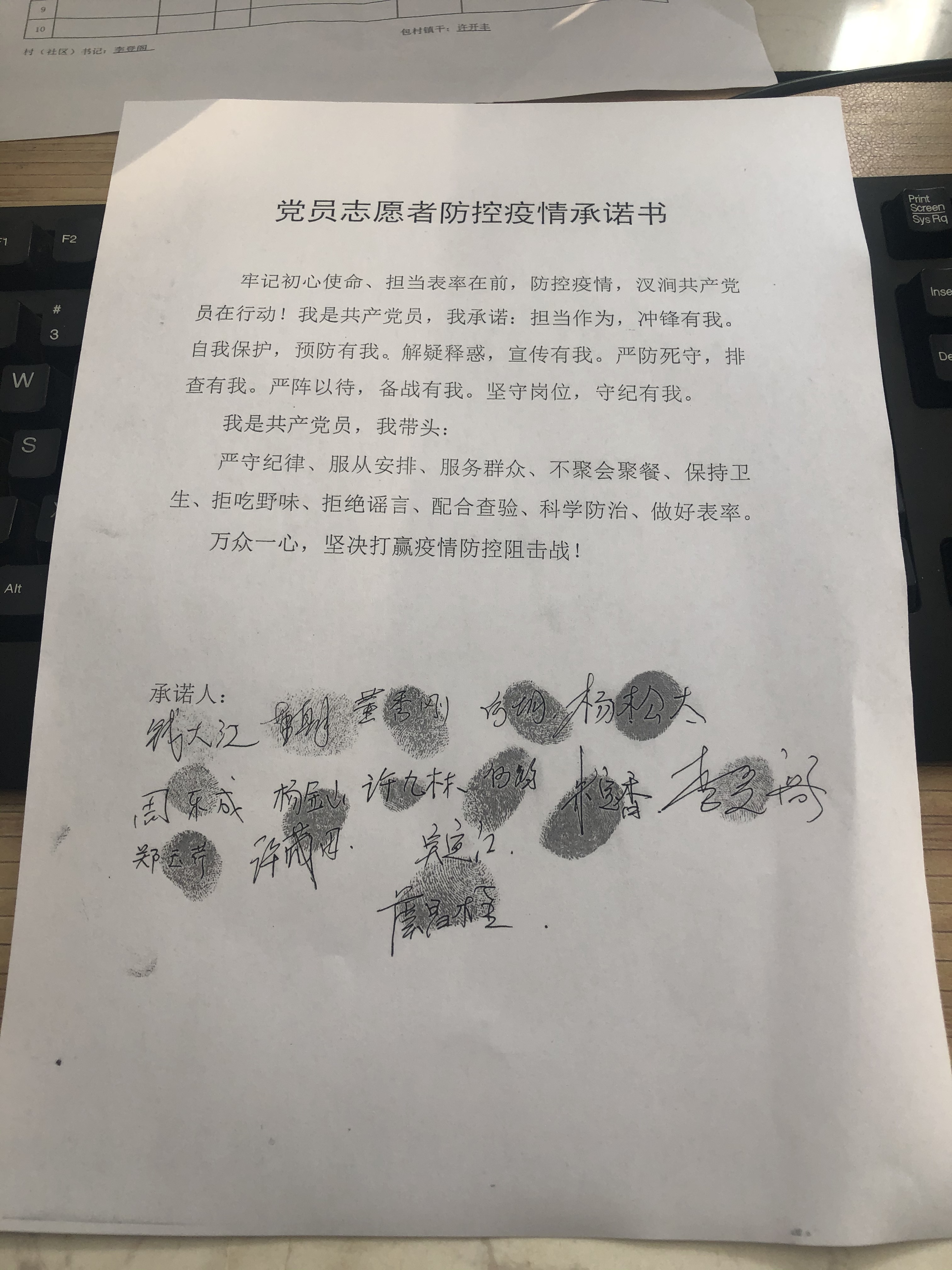 我們不曾忘記當年入黨時寫的入黨申請,也不曾忘記當年在黨旗下的宣誓,如此困難時刻、關鍵時期,我們黨員必須沖在前線,這時候才能秤出黨員的斤兩和成色。2月8日,三店村13名黨員志愿者積極到村部集合,聞令而動、紛紛請戰。他們在黨員志愿者防控疫情承諾書上簽下了自己的姓名并按下了紅色的手印,面對國旗宣誓。