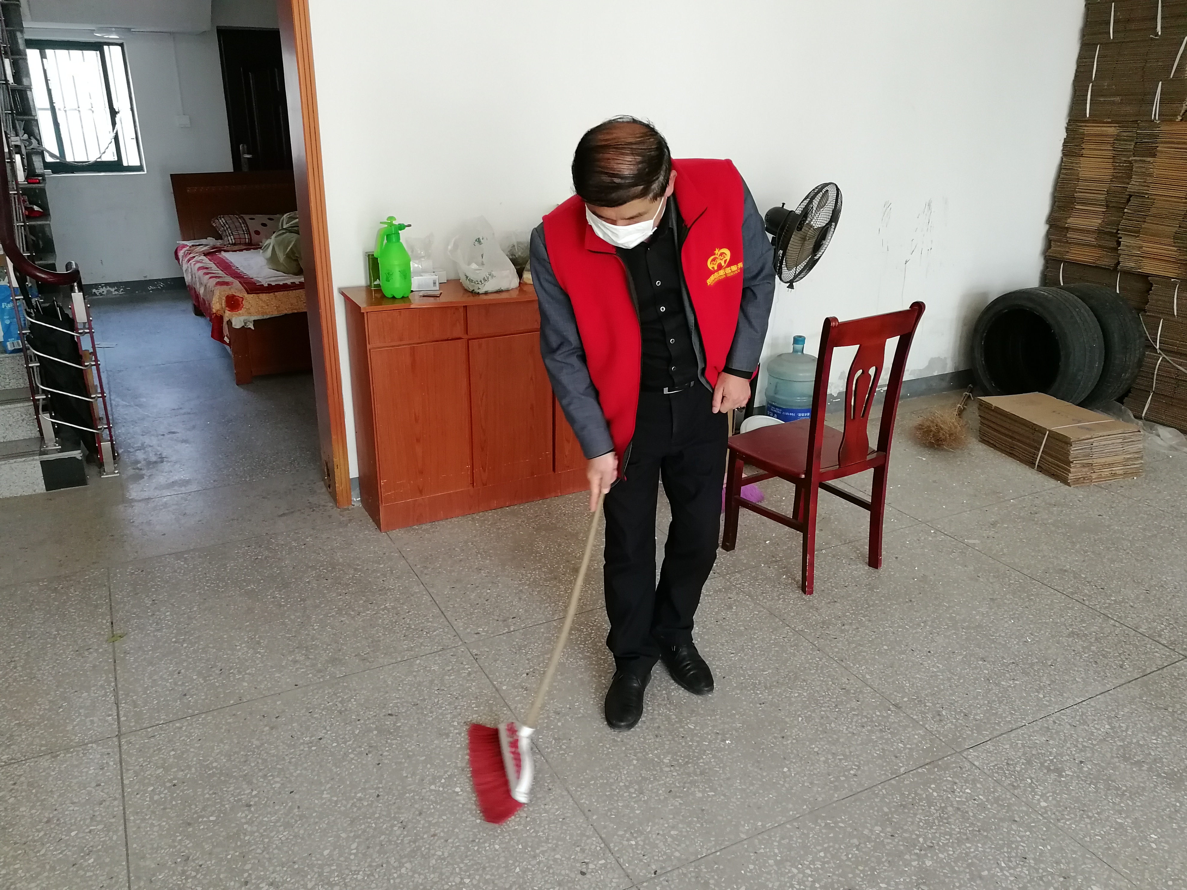 2020年3月25日上午,雙柳村“夕陽(yáng)紅”志愿服務(wù)隊(duì)開(kāi)展志愿服務(wù)活動(dòng),志愿者們身著志愿服裝,帶上消毒工具和打掃工具一一上門為失能失智老兵服務(wù),幫助他們打掃家里衛(wèi)生,利用消毒工具為他們家里消毒,跟老兵們談?wù)勑摹?/p>
