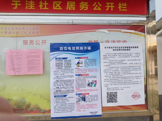 為杜絕毒品原植物在轄區(qū)內(nèi)種植和流通,從源頭上禁絕毒品,堵源截流,確保轄區(qū)實(shí)現(xiàn)“零種植”工作目標(biāo)。4月5日,于洼社區(qū)在轄區(qū)內(nèi)積極開展禁種鏟毒宣傳活動(dòng)。通過張貼禁毒標(biāo)語(yǔ)、發(fā)放禁毒宣傳資料等形式,向廣大居民宣傳國(guó)家法律法規(guī),禁種鏟毒的重要性以及毒品給人類社會(huì)帶來的嚴(yán)重危害,并鼓勵(lì)居民群眾積極檢舉揭發(fā)非法種植行為,大膽舉報(bào)非法種植毒品原植物違法人員。