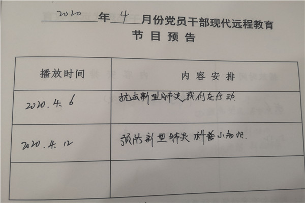為確保遠(yuǎn)教工作有序進(jìn)行,通過開展遠(yuǎn)教使黨員干部群眾的整體綜合素質(zhì)不斷提高,促進(jìn)基層組織建設(shè),推動基層組織戰(zhàn)斗堡壘和核心作用不斷增強(qiáng)。我站點計劃在本月4月6日和12日在村黨員活動室播放遠(yuǎn)教4小時,主題為專題教育。歡迎廣大黨員群眾前來觀看。