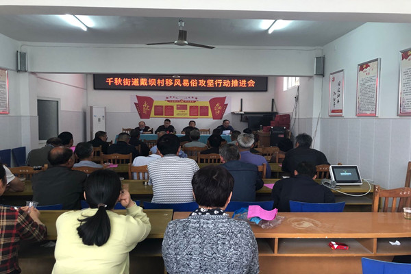 2020年5月8日,千秋街道召開居村干部會議,明確了全街道的移風易俗工作任務。會議結束后,戴壩村就積極做出響應,在群眾中發(fā)起廣泛宣傳活動。5月15日下午,召開黨員、村民代表會議,成立移風易俗領導小組、紅白理事會、發(fā)放承諾書,讓村民組長發(fā)動村民簽訂承諾書。