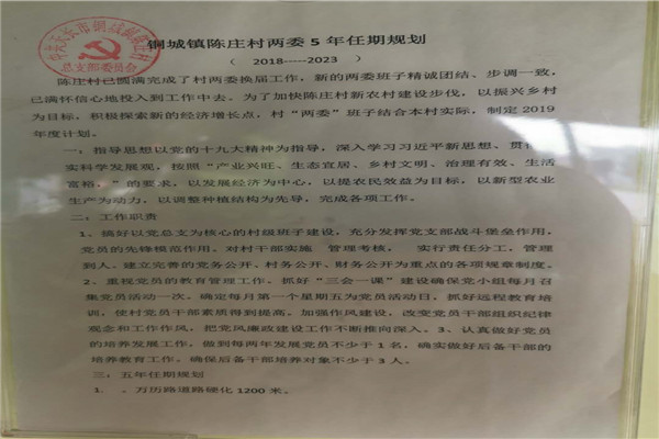 銅城鎮(zhèn)陳莊村2020年村民委員會(huì)工作職責(zé)、村兩委年度工作計(jì)劃、村兩委5年工作計(jì)劃等村務(wù)進(jìn)行公開。