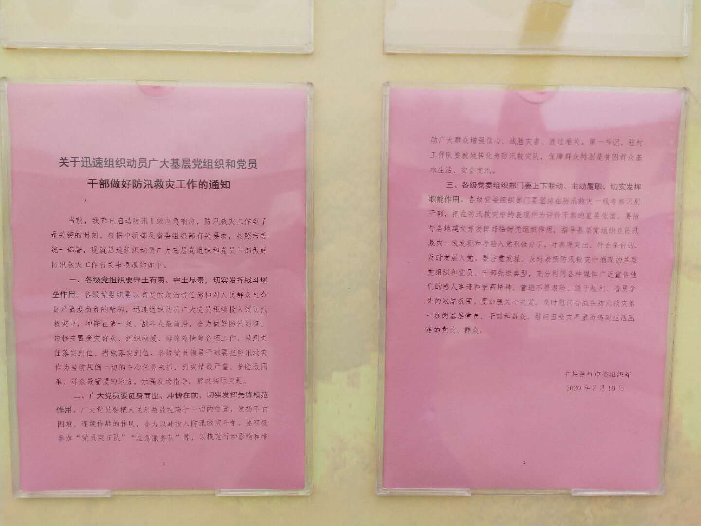 2020年7月20日應上級文件指示,要求各村黨務公開欄張貼關于迅速動員廣大基層黨組織和黨員干部做好防汛救災工作的通知。各級黨員領導干部要把防汛救災作為當前壓倒一切的中心任務來抓,到災情最嚴重、搶錢最困難、群眾最需要的地方,加強現場指導,解決實際問題。