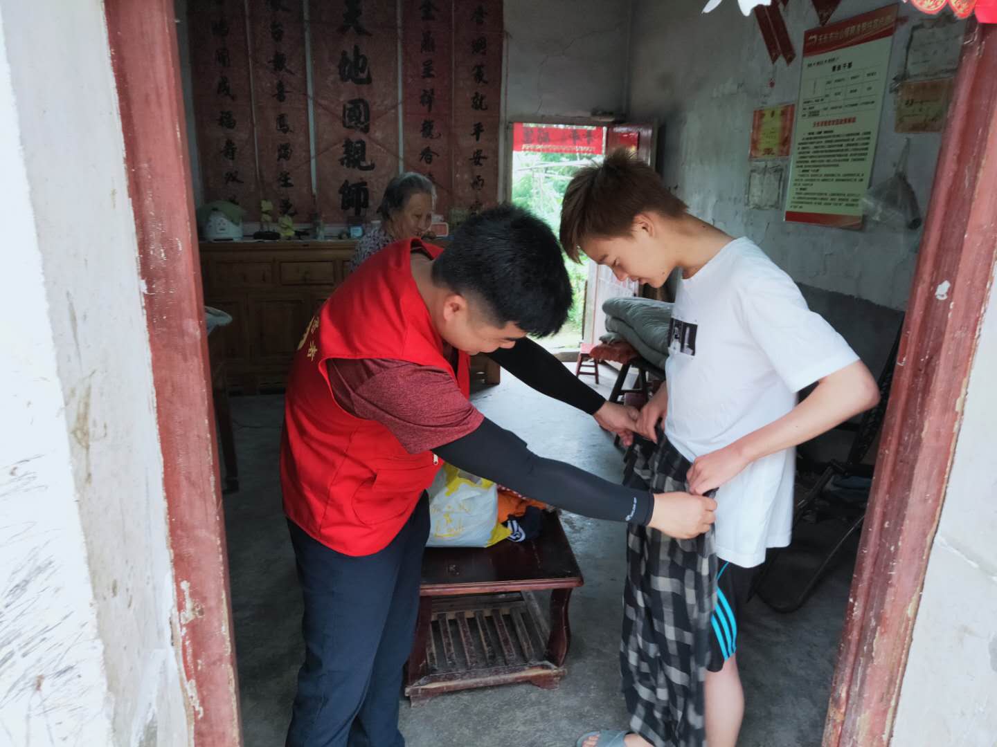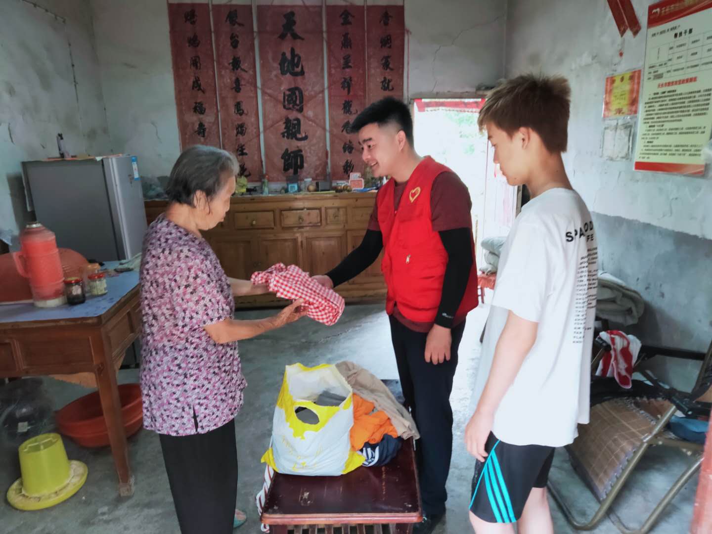 2020年7月6日,張巷村民兵營長陳良春為村孤兒洪勇送去衣物等生活用品。