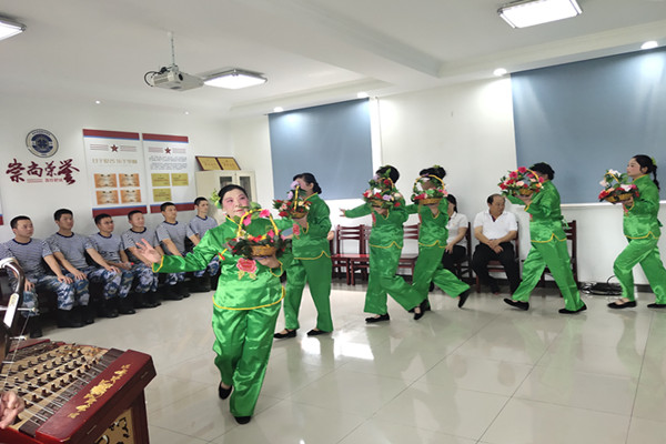 演出活動在部隊會議室臨時搭建,在歌曲《紅梅贊》中拉開了慰問演出的序幕。由社區文藝志愿者表演的歌舞《南泥灣》再現了當年我們的革命先輩在延安又戰斗又生產的壯麗場景;一針一線繡紅旗,一生一曲詠忠誠,革命歌曲《繡紅旗》言猶在耳,句句動人心,展現出巾幗不讓須眉的英雄氣概······一曲大合唱《歌唱祖國》將整場演出推向高潮,現場部隊官兵與社區文藝志愿者們熱情互動,演繹了一幅軍民魚水一家親的生動畫面。