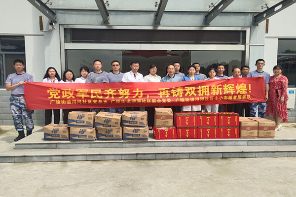 7月31日,“八一“建軍節即將來臨之際,由廣陵街道潯河社區聯合黨委、新時代文明實踐站攜手愛心企業組成慰問組走進駐我市的海軍某部靶場,為部隊官兵們送去了大米、食用油和飲料等節日慰問品,并為戰士們帶去了一場精彩的文藝演出,與部隊官兵共同慶祝“八一”建軍節,并向他們致以節日的祝賀和親切的慰問。