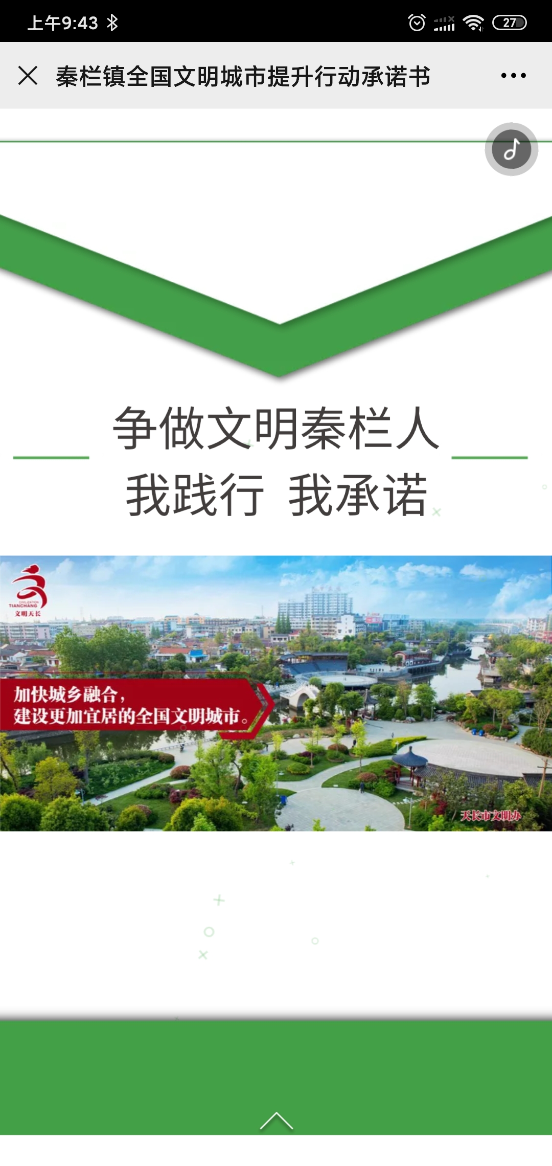 文明承諾做表率。秦欄鎮(zhèn)制作線上承諾書(shū),群眾廣泛轉(zhuǎn)發(fā)朋友圈,承諾文明在手上,自覺(jué)維護(hù)環(huán)境衛(wèi)生,當(dāng)好文明行為的實(shí)踐者;承諾文明在腳下,自覺(jué)遵守交通規(guī)則,當(dāng)好文明行為的引領(lǐng)者;承諾文明在心中,大力推進(jìn)移風(fēng)易俗,倡導(dǎo)樹(shù)文明新風(fēng),自覺(jué)踐行“奉獻(xiàn)、友愛(ài)、互助、進(jìn)步”的志愿者精神,參與志愿服務(wù),提升全社會(huì)精神文明水平。