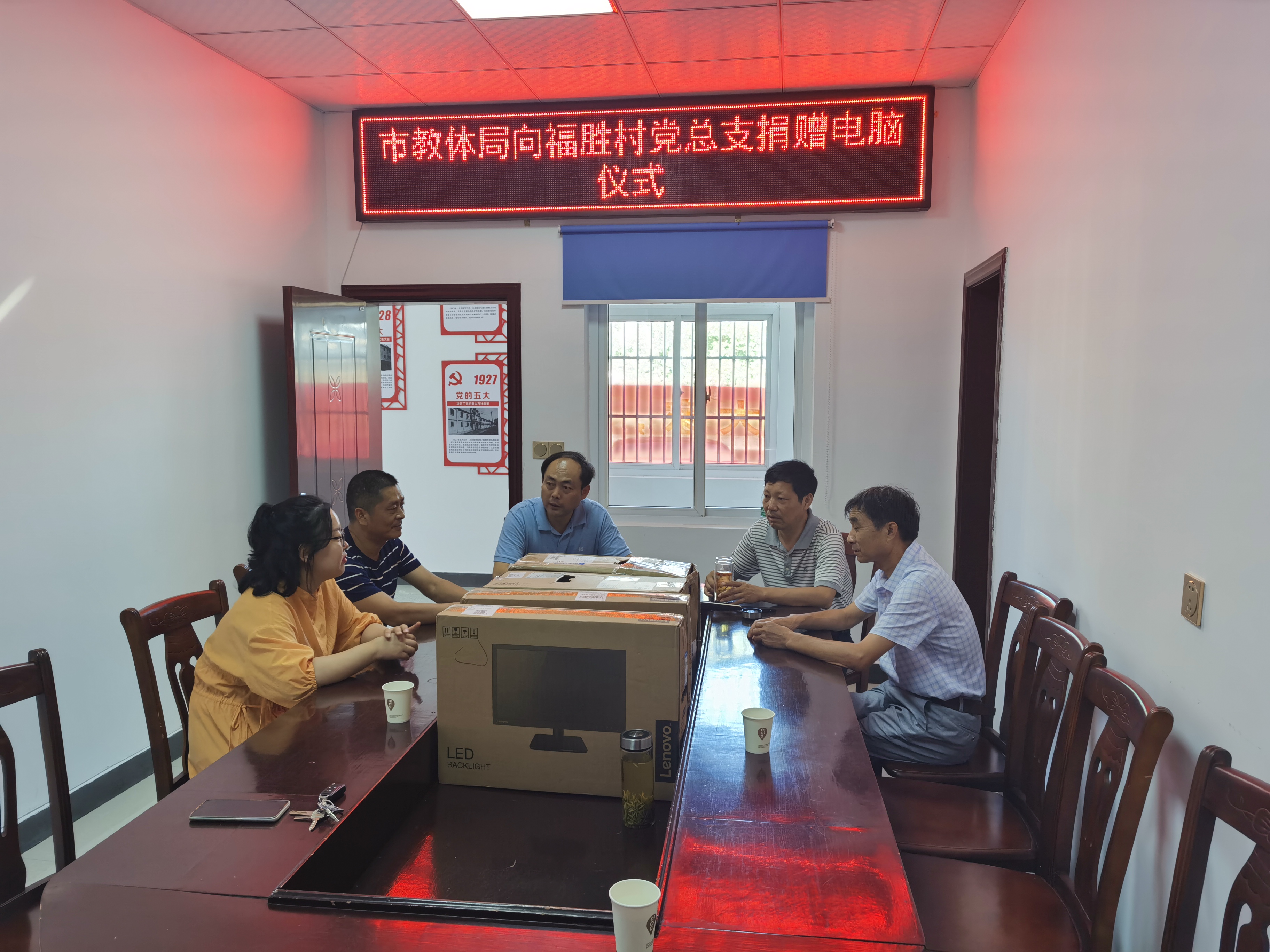 8月13日下午,市教體工委副書記董啟湖、福勝村黨總支第一書記胡忠鋒一行來到福勝村指導黨建工作;同時,考慮到新到任兩名預任制村官辦公的方便,捐贈福勝村黨總支兩臺辦公電腦。