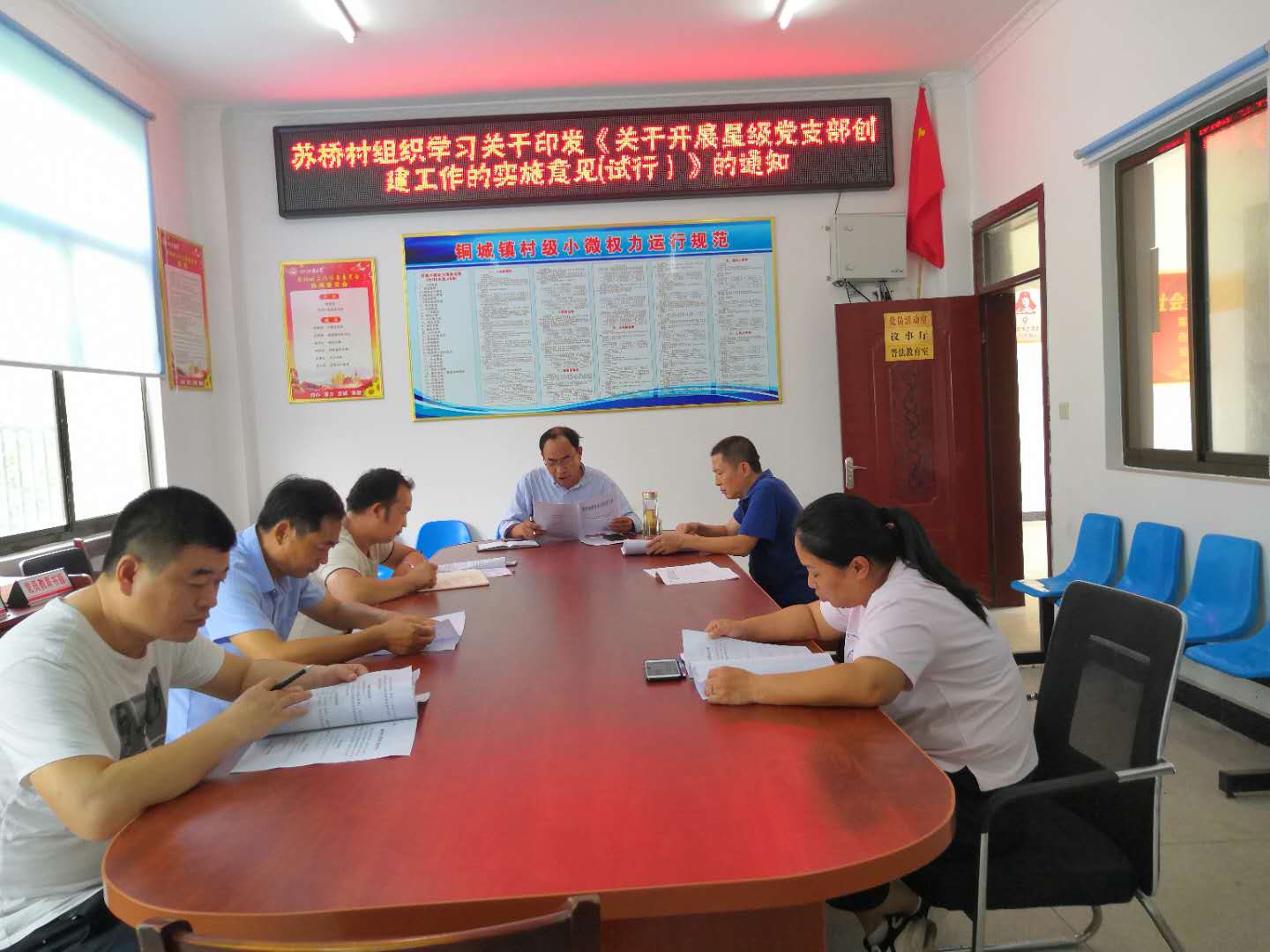 2020年9月2日上午,蘇橋村兩委組織學(xué)習(xí)上級(jí)關(guān)于印發(fā)《關(guān)于開展星級(jí)黨支部創(chuàng)建工作的實(shí)施意見(實(shí)行)》的通知。文件明確了目標(biāo)任務(wù)、制定創(chuàng)新標(biāo)準(zhǔn)、規(guī)范評(píng)星程序、強(qiáng)化結(jié)果運(yùn)用和壓實(shí)工作責(zé)任,根據(jù)《中國(guó)共產(chǎn)黨章程》 《中國(guó)共產(chǎn)黨支部工作條例(試行)》及《安徽省農(nóng)村基層黨組織建設(shè)標(biāo)準(zhǔn)(試行)》等,制定農(nóng)村星級(jí)基本標(biāo)準(zhǔn)。