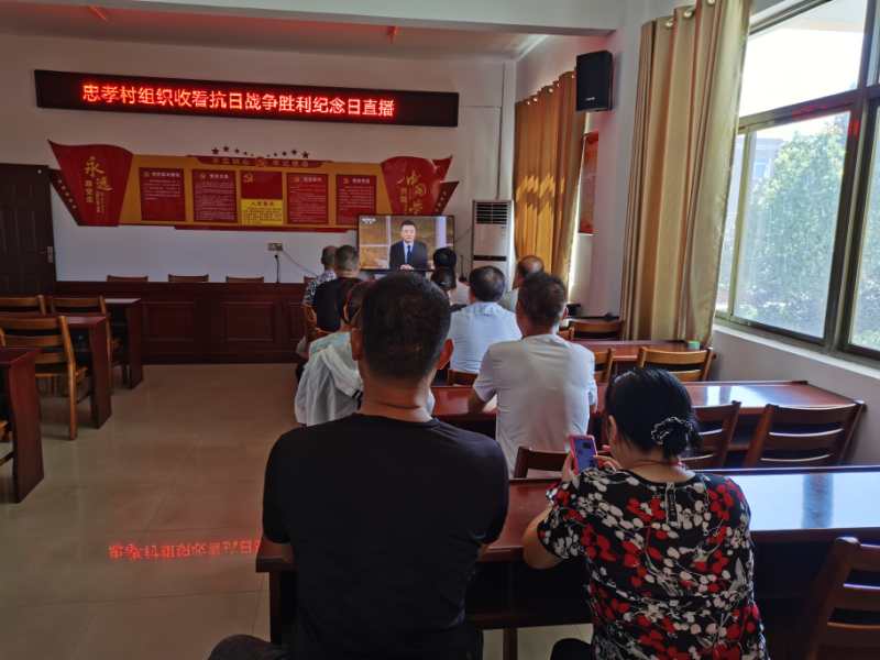 9月4日上午,忠孝村全體村干、黨員代表及群眾代表齊聚一堂,集體收看了紀念中國人民抗日戰爭暨世界反法西斯戰爭勝利75周年大會實況直播,重溫抗戰歷史,緬懷先烈。