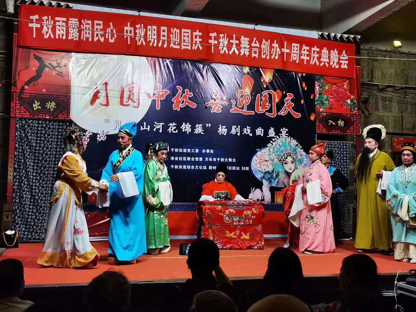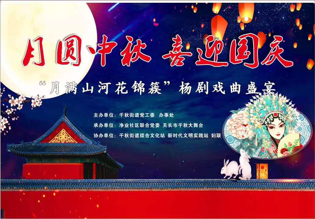 為倡導文明、和諧、喜慶、節儉的現代節日理念,讓社區居民在移風易俗中體現人文關懷,豐富精神娛樂生活,積極享受節日的快樂,由千秋街道黨工委、辦事處主辦,凈業社區聯合黨委承辦,千秋街道文化站等部門協辦的“月滿山河花錦簇”揚劇戲曲盛宴于2020年9月29日在凈業社區千秋大舞臺隆重上演。