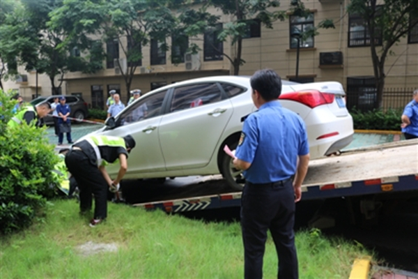 天長市城市社區綜合執法隊整治二鳳社區易居天韻小區車輛占用消防通道問題。