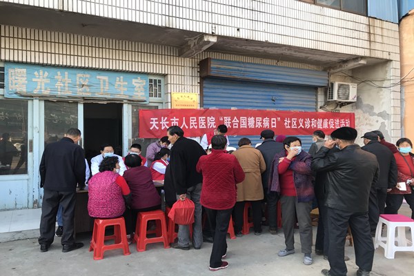 為促進社會全民健康,共同了解、有效預防和治療糖尿病,共同為全民健康筑起綠色防護墻。像往年一樣,我們曙光社區在今年的11月23日也繼續響應號召,通過精心的組織、宣傳和布置,和天長市人民醫院的義診醫生、護士們一起,在曙光社區衛生室組織開展了“聯合國糖尿病日”社區義診促進健康活動。一大早,社區工作人員和醫院的醫護人員在曙光社區衛生室門口搭建了義診臺,拉起醒目的橫幅,向過往的行人宣傳針對糖尿病的危害和預防治療,同時為轄區內需要檢查身體的老百姓提供相應的義診服務,并發放宣傳關于糖尿病的防治手冊,幫助、提醒老百姓在日常生活中注意對糖尿病的預防及其注意事項,做到“時刻預防、及時發現、及時治療、遠離痛苦”。