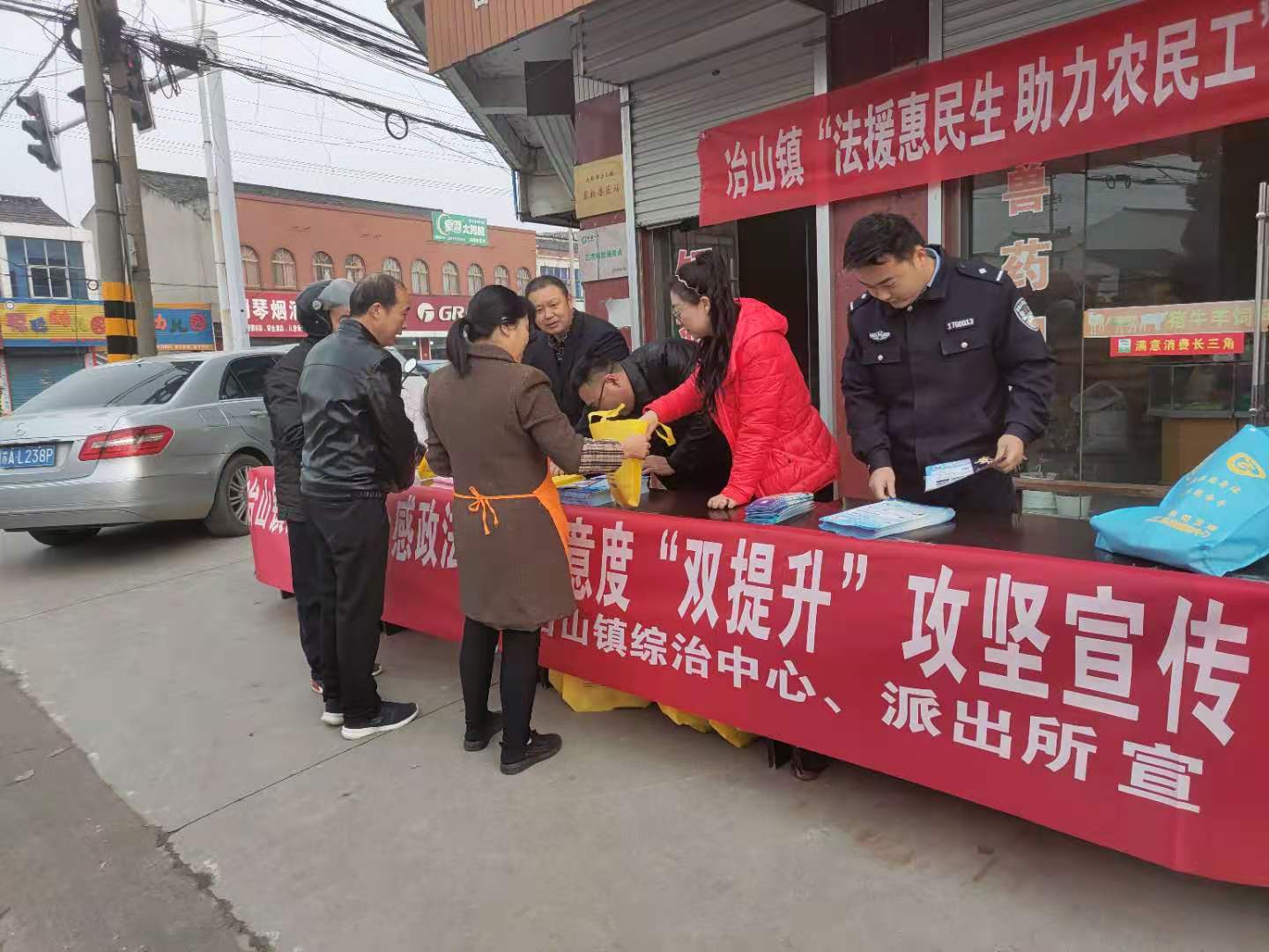 冶山鎮綜治中心聯合司法所、派出所利用逢集時間,在關塘農貿市場、超市等人流量大、人口密集的地方,通過懸掛宣傳橫幅、擺放宣傳板、發放宣傳手冊等形式,廣泛向群眾宣傳社會治安、平安建設、禁毒禁賭、法律援助、防范電信詐騙、民法典、反邪教等方面知識。