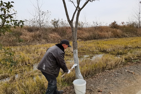 白漆的主要成分是石灰乳,還有食鹽,大豆粉,石榴合劑。我們地處北半球,冬天早晚冷熱差異很大,植物最易凍傷,把植物刷白后,白色可以反射白天的太陽光和各種輻射,避免植物體溫度過高,大大減弱了白天與晚上的溫度差異,避免植物受到突然變溫的傷害。另外,秋后初冬,許多昆蟲喜歡在老樹皮的裂縫中產卵過冬,刷白劑對許多的害蟲有殺滅作用。