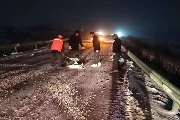 下午五六點正是居民出行下班的高峰期,高架上已經堆積了一層厚厚的雪,過往的車輛稍不注意,便會發生意外。于是,大家集中火力開始撒鹽、掃雪、鏟雪,在最短的時間里為過往的車輛開辟出一條“安全通道”,掃雪的熱情絲毫沒有因寒冷的天氣而退減,經過一個多小時的戰斗,高架上的雪被清理了許多,保障了雪天車輛的安全通行。