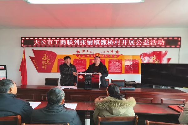 在捐贈儀式會上,揚子公司為魏橋村便民服務大廳贈送了一臺揚子牌凈水機,在現場和村副書記吳大山舉行了交接儀式。接著由天長市工商聯汪主任向參會的隊長、黨員宣傳了上級惠民政策,特別是關系到農村飲用水安全的相關常識等。