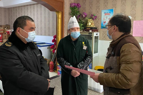 一行先后來到旭日酒店、朋來農家樂、蘇果超市等場所,分別檢查了掃碼登記、場所消毒、冷鏈食品來源、食品衛生、公勺公筷提供等情況。鎮黨委委員、宣傳委員毛崇耀就最新的2號防疫通告進行現場解讀、宣傳,要求自通告發布之日起,酒店、餐館、農家樂緩辦紅事,簡辦白事,停辦其他事,嚴格遵守疫情防控最新規定,引導進店顧客體溫檢測、查驗“健康碼”、錯峰就餐、使用公勺公筷、杜絕餐飲浪費。市場所分別對超市、酒店的冷鏈食品、環境衛生等進行檢查,要求謹慎采購、加工和食用冷鏈食品,做好食品留樣,保障食品安全。
