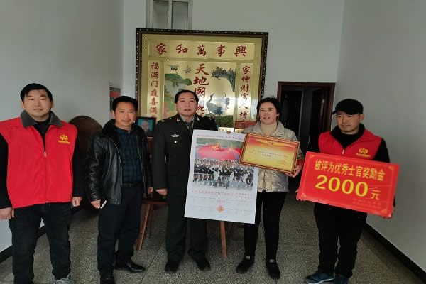 2月2日上午張鋪鎮武裝部部長朱正峰、魏橋村黨總支書記蔡萬余等人把“優秀士官”的喜報送到陳等云家中。