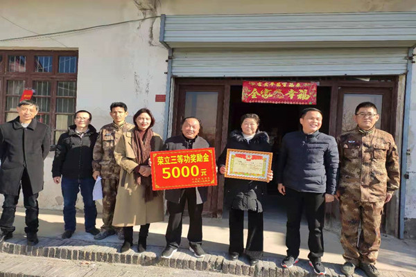 2月18日上午,伴隨著陣陣鑼鼓聲,仁和集鎮黨委書記高東軍、武裝部部長王愛劍等一行來到仁和集鎮林莊村,將立功喜報送到榮立三等功現役軍人楊兆明家中。