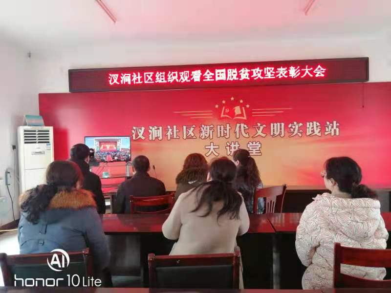 2021年2月25日上午,汊澗社區組織工作人員一起在二樓會議室通過電視直播觀看全國脫貧攻堅表彰大會。