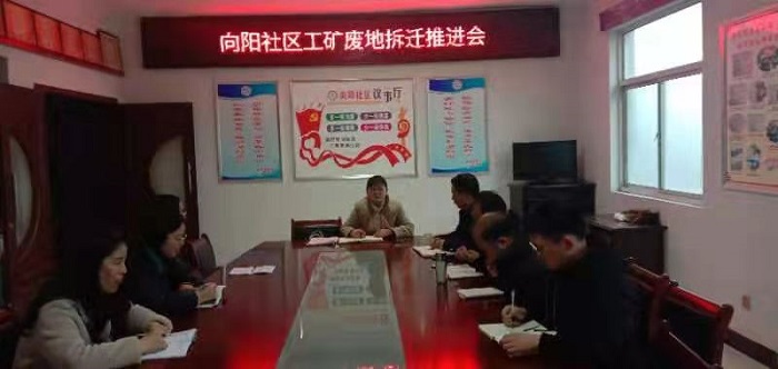 向陽社區召開兩委會,就工礦廢地拆遷工作進行了詳細安排,會上成立四個工作組,全部投入到一線,逐戶開展工作。隨時上報進度。確保按時完成上級要求的進度。