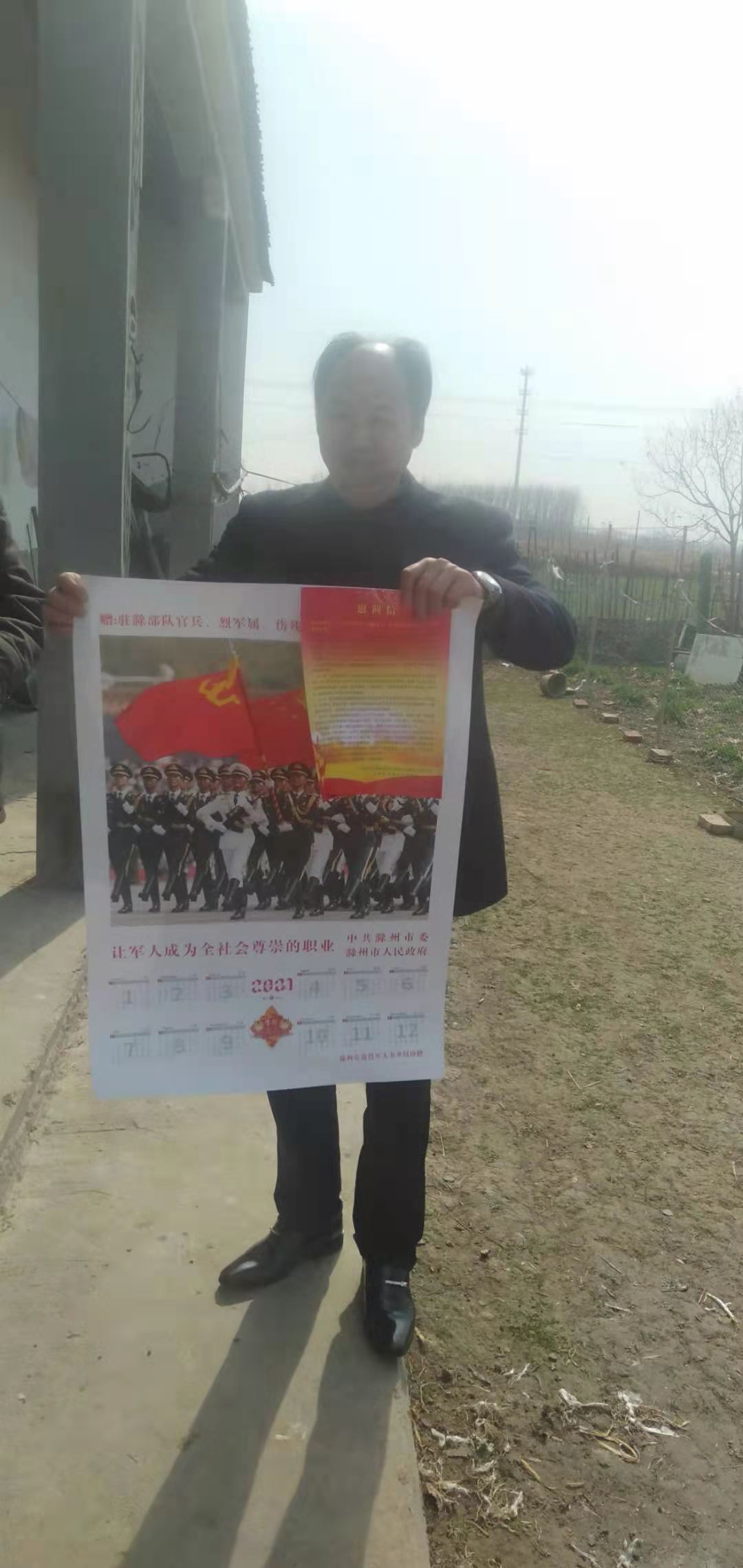 三店村工作人員上門送溫暖,送掛歷,送祝福,走進革命老戰士家中,退役老兵周大爺高興地說:“每年都想著我這老兵,感謝黨和政府的關懷。”