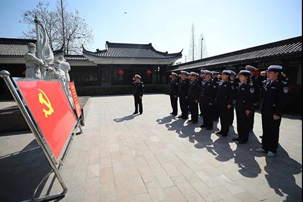 在抗大八分校紀念館,天長市公安交管大隊的20名民警列隊肅立,面向黨旗,舉起右拳,重溫入黨誓詞??犊ぐ旱男模磉_了公安民警恪盡職守、廉潔奉公的決心和擔當。