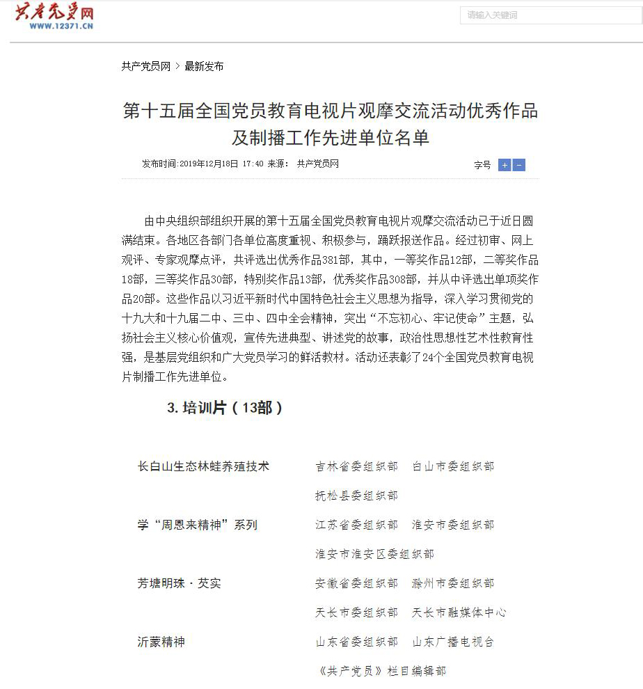 12月18日,中共中央組織部發布《第十五屆全國黨員教育電視片觀摩交流活動優秀作品及制播工作先進單位名單》,天長市參評作品《芳塘明珠•芡實》在第十五屆全國黨員教育電視片觀摩交流活動中獲優秀作品獎,該活動每兩年舉辦一次。