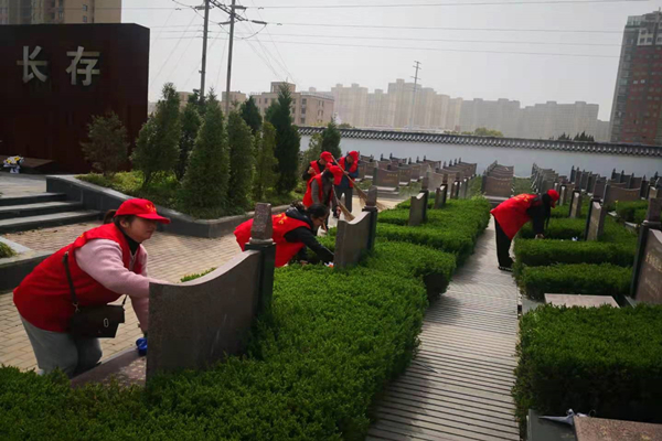 在烈士墓地,全體祭掃人員對烈士的墓碑進行擦拭清理,打掃周邊環境衛生,并進行集體祭拜活動。