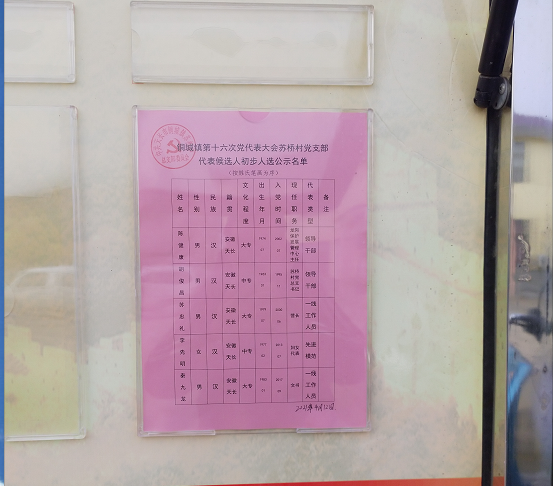 2021年4月12日,經(jīng)蘇橋村黨總支委員會(huì)醞釀、黨員大會(huì)推薦出5名黨代表,出席鎮(zhèn)第十六屆黨代會(huì)候選人名單進(jìn)行了全村公示,公示時(shí)間為7天。在無(wú)異議的情況下組織召開(kāi)黨員大會(huì)進(jìn)行選舉產(chǎn)生4名正式黨代表!