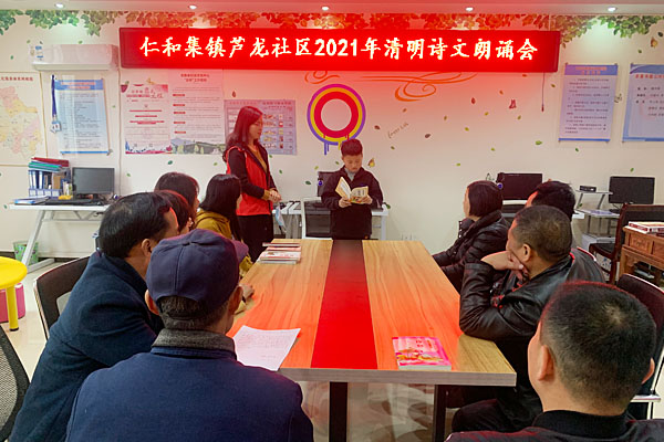 4月2日上午,蘆龍社區在農家書屋舉辦了一個小型詩文朗誦會,以"緬懷革命先烈,朗誦詩歌清明祭英靈"為主題悼念先烈。