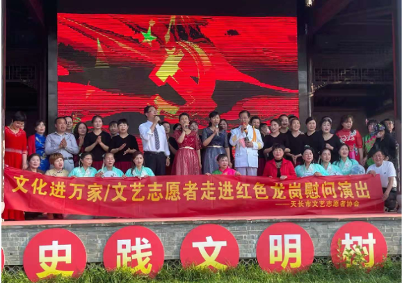 2021年5月22日,“學黨史、傳精神、跟黨走”——中國文藝志愿者在行動走進紅色龍崗主題活動慰問演出,在紅色龍崗社區大舞臺,慰問演出熱烈而莊重。由新風新街文藝志愿者的一曲大型舞蹈《在希望的田野上》拉開慰問演出序幕,整場慰問演出分為“血染紅土地”“花開映山紅”“唱響中國夢”三個篇章。在上篇“血染紅土地”中,由天長市文藝志愿者表演的歌伴舞《繡紅旗》、小品《智斗》、歌曲《紅梅贊》等紅色歌曲,將觀眾帶回了那段烽火連天、軍民情深的戰爭歲月;在“花開映山紅”篇章中,天長市千秋揚劇團、天長市黃梅戲的文藝志愿者《贊龍崗》《到底人間歡樂多》等歌舞,贊美在中國共產黨領導下,天長人民傳承革命精神邁入新時代的豪情;茉莉飄香文藝志愿者表演的《聞雞起舞》讓觀眾捧腹不已,贏得陣陣掌聲和喝彩。在“唱響中國夢”篇章,銅城鎮揚劇團文藝志愿者表演的快板《還是家鄉好》,新風新街文化志愿者表演的舞蹈《我的中國》等,文藝志愿者們用他們優美的舞姿,讓觀眾收獲美感和感動。最后,全體演員共同演唱了《沒有共產黨就沒有新中國》,為整場演出畫上圓滿的句號。