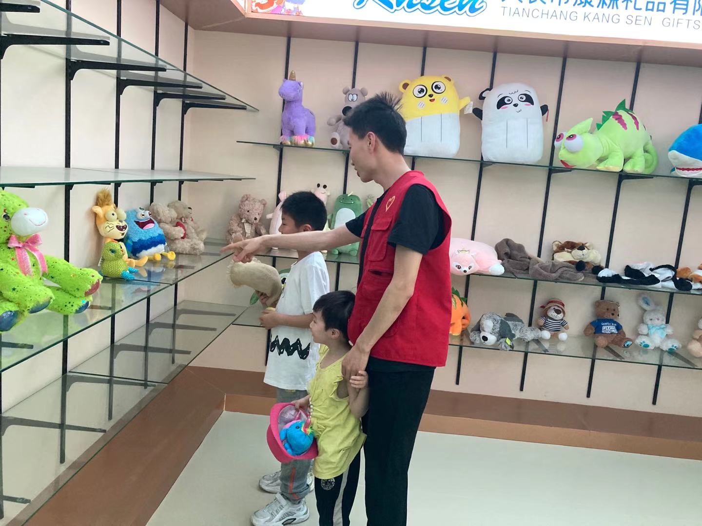 志愿者們在特色小鎮展覽館接待前來參加活動的家長和小朋友們,引領他們參觀玩具企業展出的各色產品,小朋友們被眼前的玩具吸引,連連發出贊嘆的聲音。