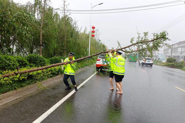圖說:天長市交通局組織黨員進行道路安全巡查,清理戶外廣告牌,清除公路倒伏行道樹,責令渡口停航停運船舶,確保臺風過境期間各項工作正常運轉。