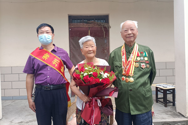8月13日上午,天長(zhǎng)市文聯(lián)組織文藝志愿者準(zhǔn)備了鮮花、水果等慰問(wèn)品,來(lái)到天長(zhǎng)市廣陵街道潯河社區(qū)翠微花園小區(qū)的抗戰(zhàn)老兵高維田家中,為高老及愛(ài)人唐允珍夫婦送來(lái)節(jié)日的祝福。志愿者們將一束玫瑰花和書(shū)法“幸福美滿”及慰問(wèn)品遞給兩位老人,作為七夕節(jié)禮物,老夫妻們笑得合不攏嘴。